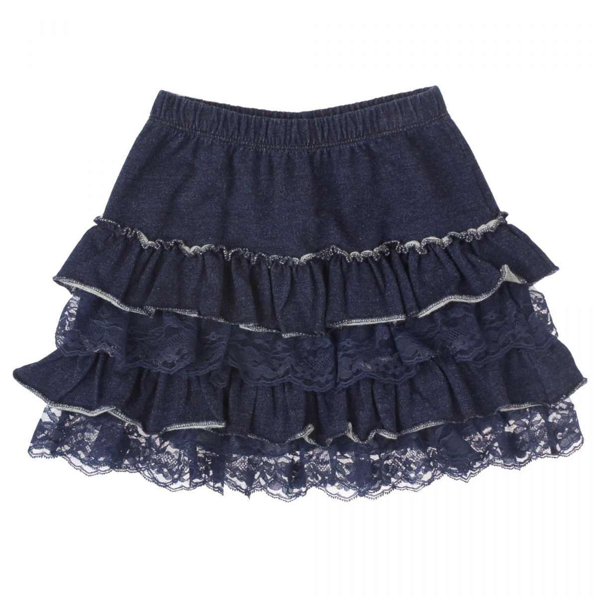 Юбка пошита из плотного трикотажа под джинсу. Очень симпатичное кружево на оборках. Не мнется. На худенькую девочку ростом 108 размер 110 сел просто идеально. Длина - чуть выше колена, длиннее, чем на фото. Смотрится очень красиво. Как нарядная тоже сойдет.